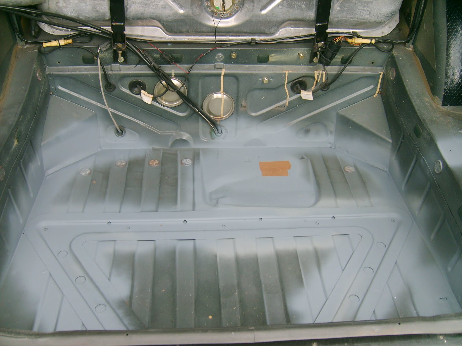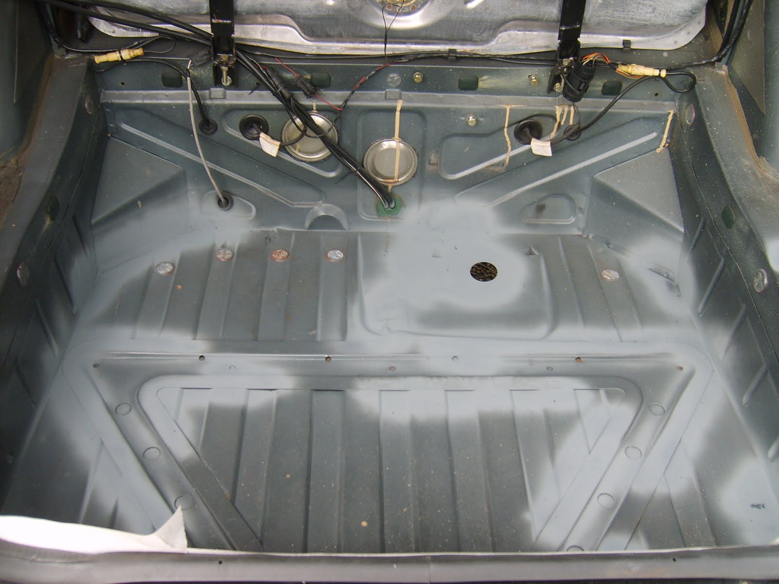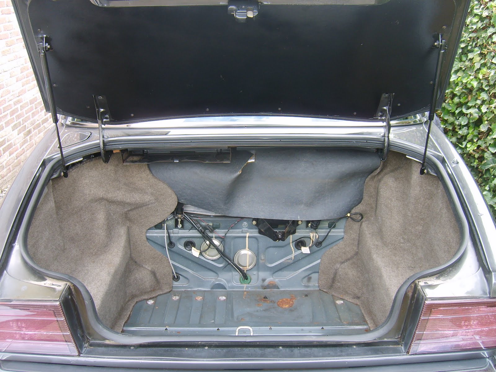 Een beetje oppervlakkige roestvorming in de koffer verbaast mij niet echt. Een volledig doorgeroeste bodem stop. Deze moet vervangen worden door een nieuwe. Het achter paneel tussen de achterlichten heeft blijkbaar al een anti roest behandeling gekregen door de vorige eigenaar maar met niet al te groot succes.