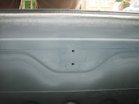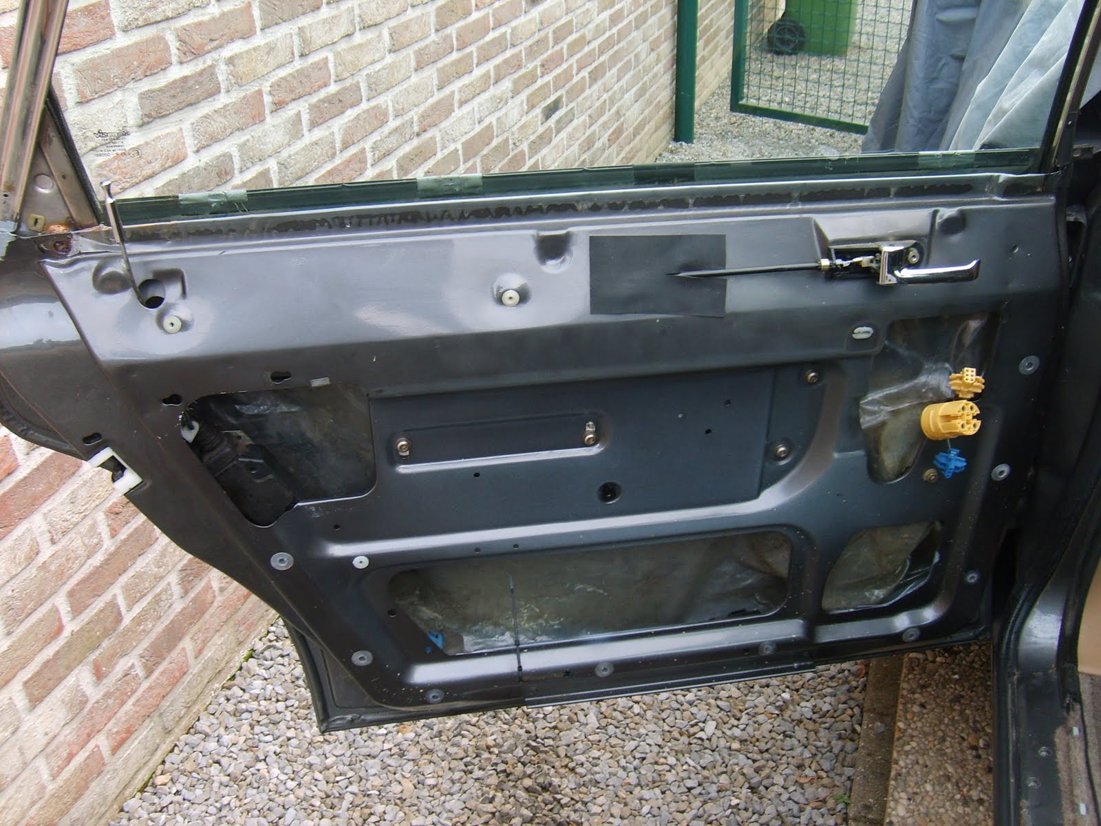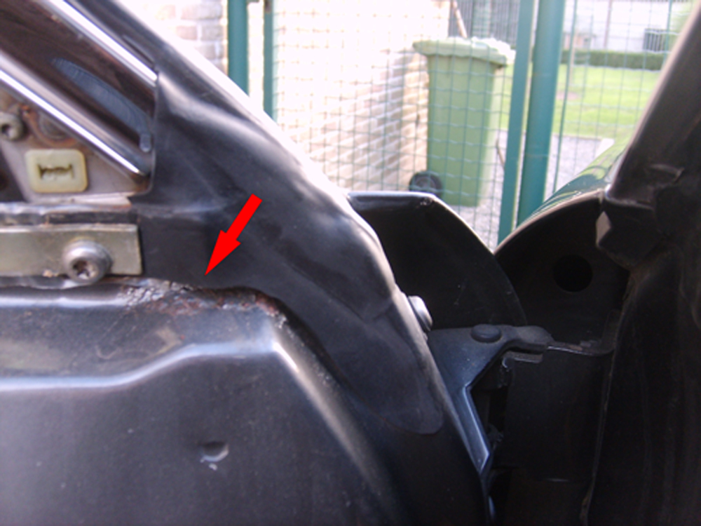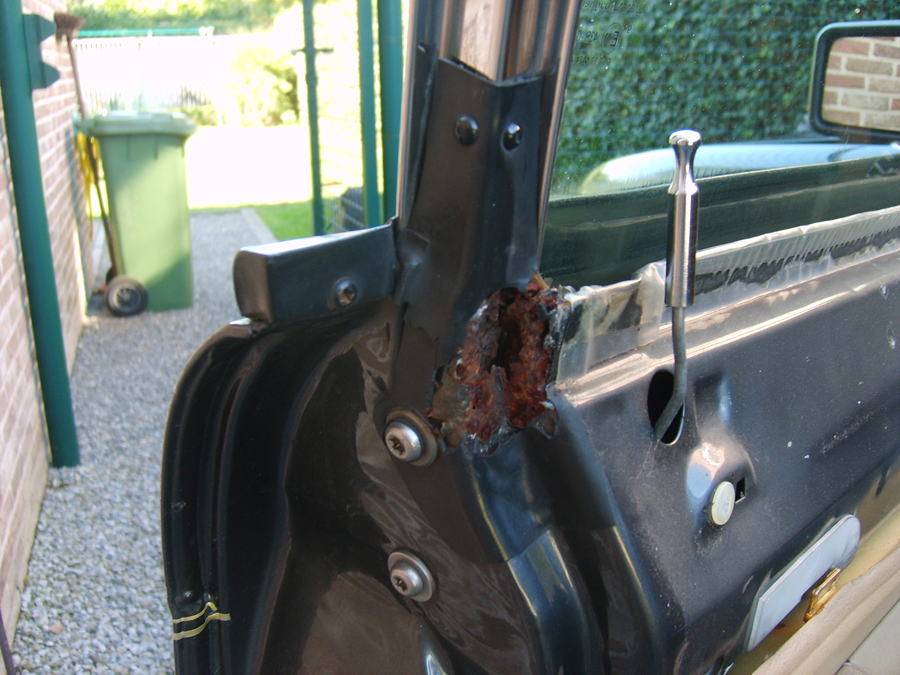 Tot mijn grote verbazing zien de binnenplaten van de deuren er nog heel goed uit. Nergens geen roest te bekennen. Het mag ook eens meevallen, hé. De binnenkant onderaan goed zuiver maken met een harde borstel.