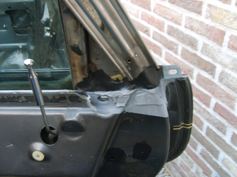 Ik heb alle roest verwijderd met een slijpsteen gemonteerd op een kleine boormachine. Lukt aardig goed. De roest aan de binnenkant van de deur is moeilijker bereikbaar. Die moeilijk bereikbare plaatsen heb ik zo veel mogelijk ingesmeerd met roestomvormer. Een laagje zinkspray en een laagje grondverf moet voorkomen dat de roest na enige tijd terug de kop op steekt. Als vervanging van de rubber heb ik de naden afgekit met een elastische kit. Deze wordt niet hard en belet het doorsijpelen van water. Dat hoop ik tenminste!