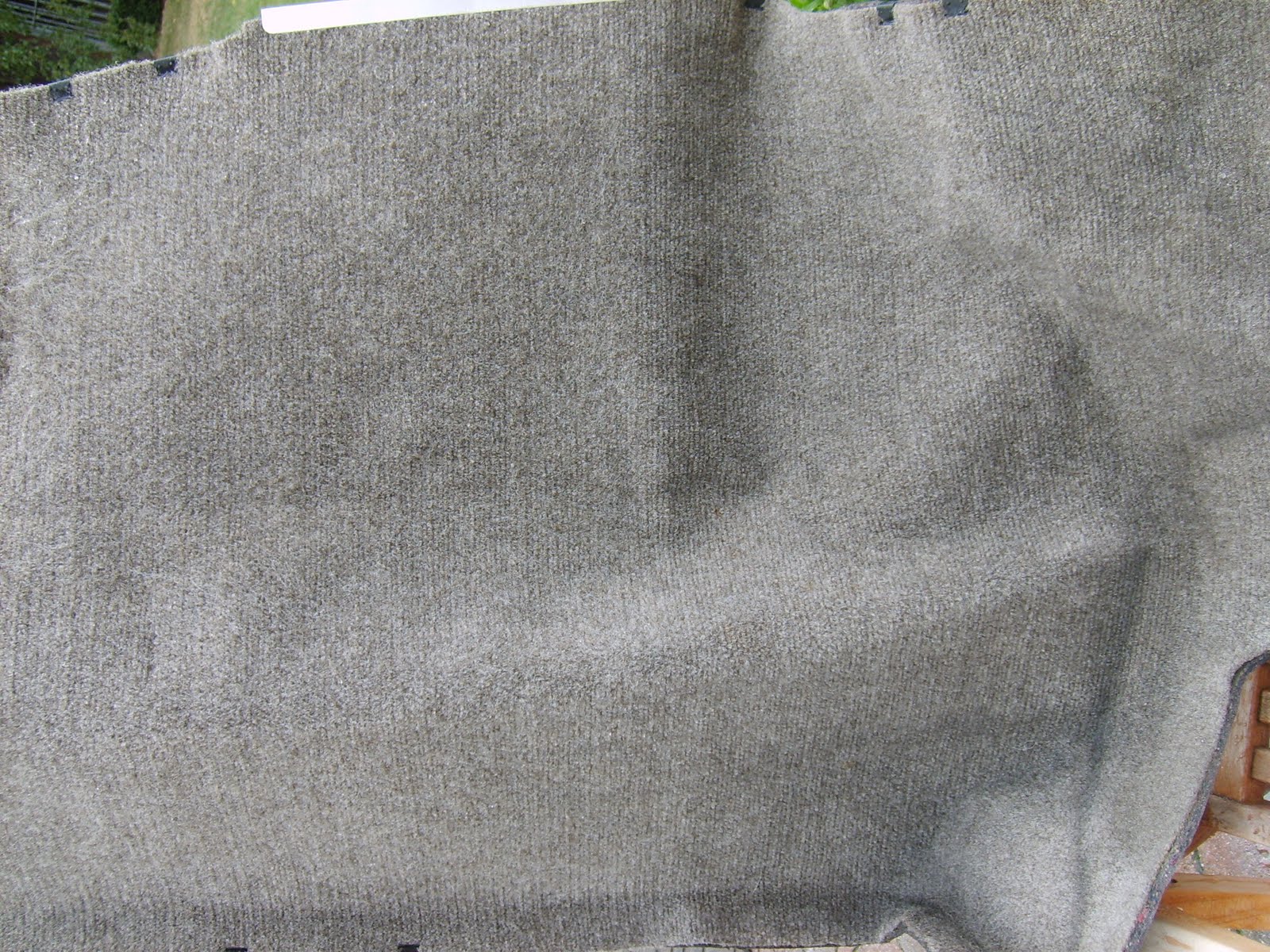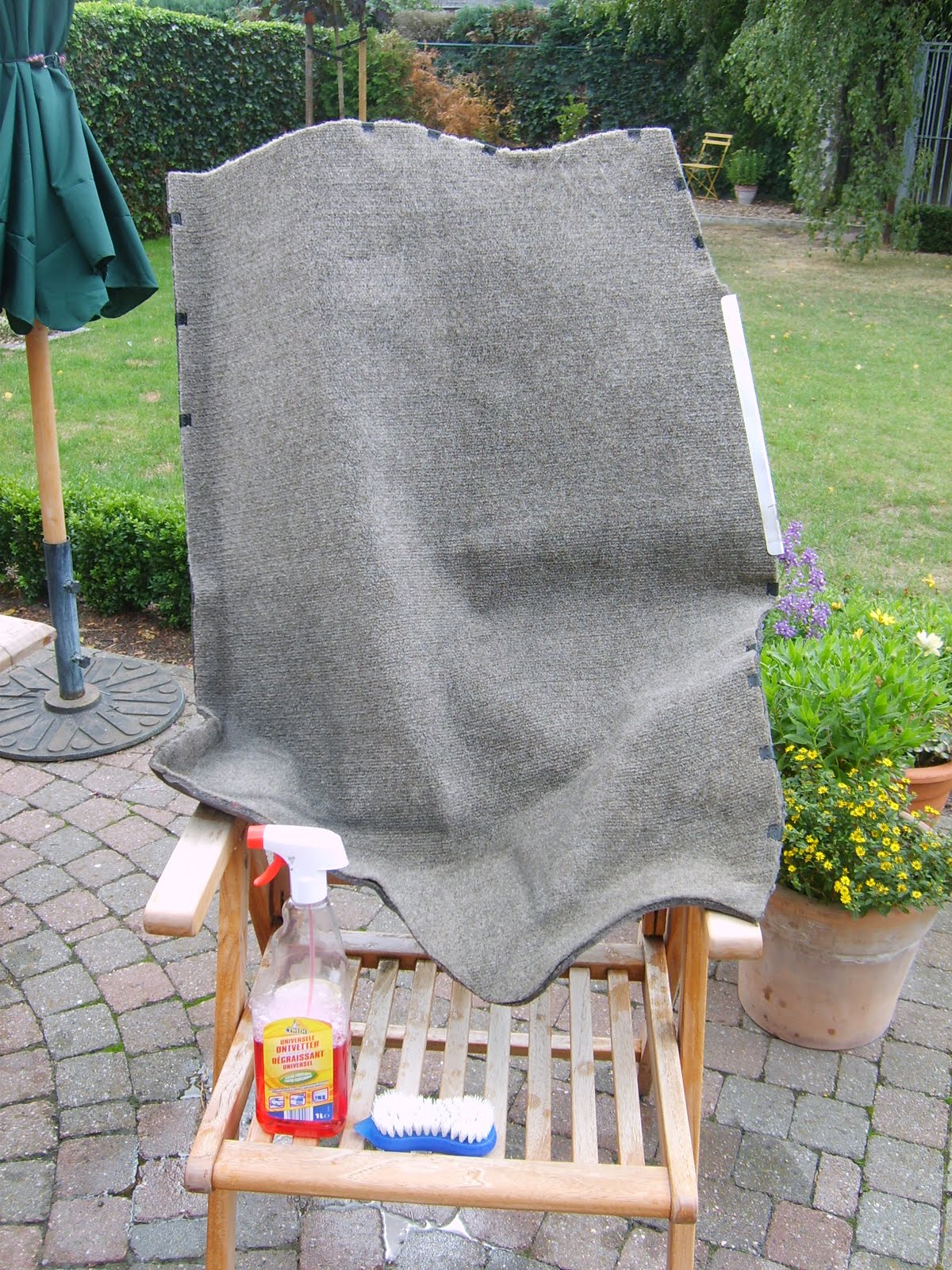Het tapijt heb ik gereinigd met de borstel en Twido ontvetter. Nadien goed afspoelen met de tuinslang en laten drogen in de zon. Opmerkelijk wat een verschil. Het tapijt lijkt wel nieuw.