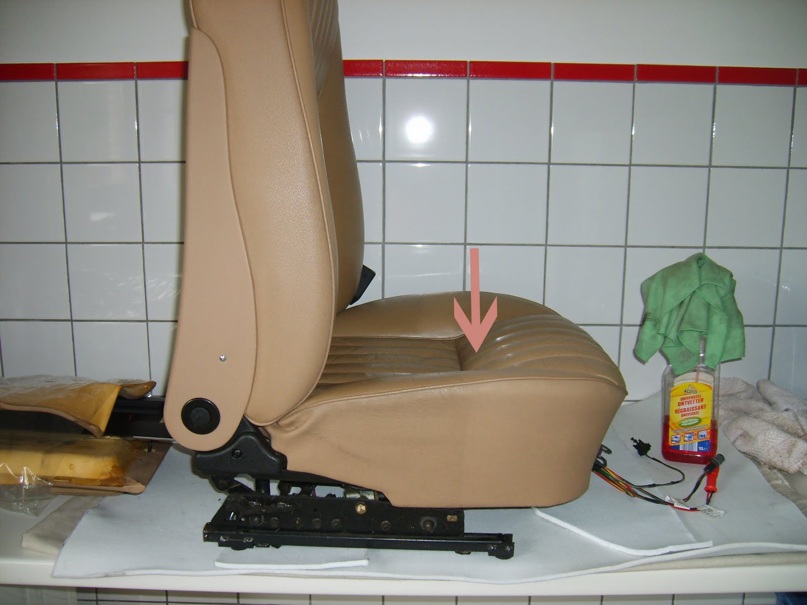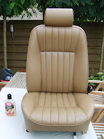 De passagiers zetel lijkt wel nieuw na een behandeling met de gebruikelijke producten. Het leder na poetsen rijkelijk behandelen met conditioner.