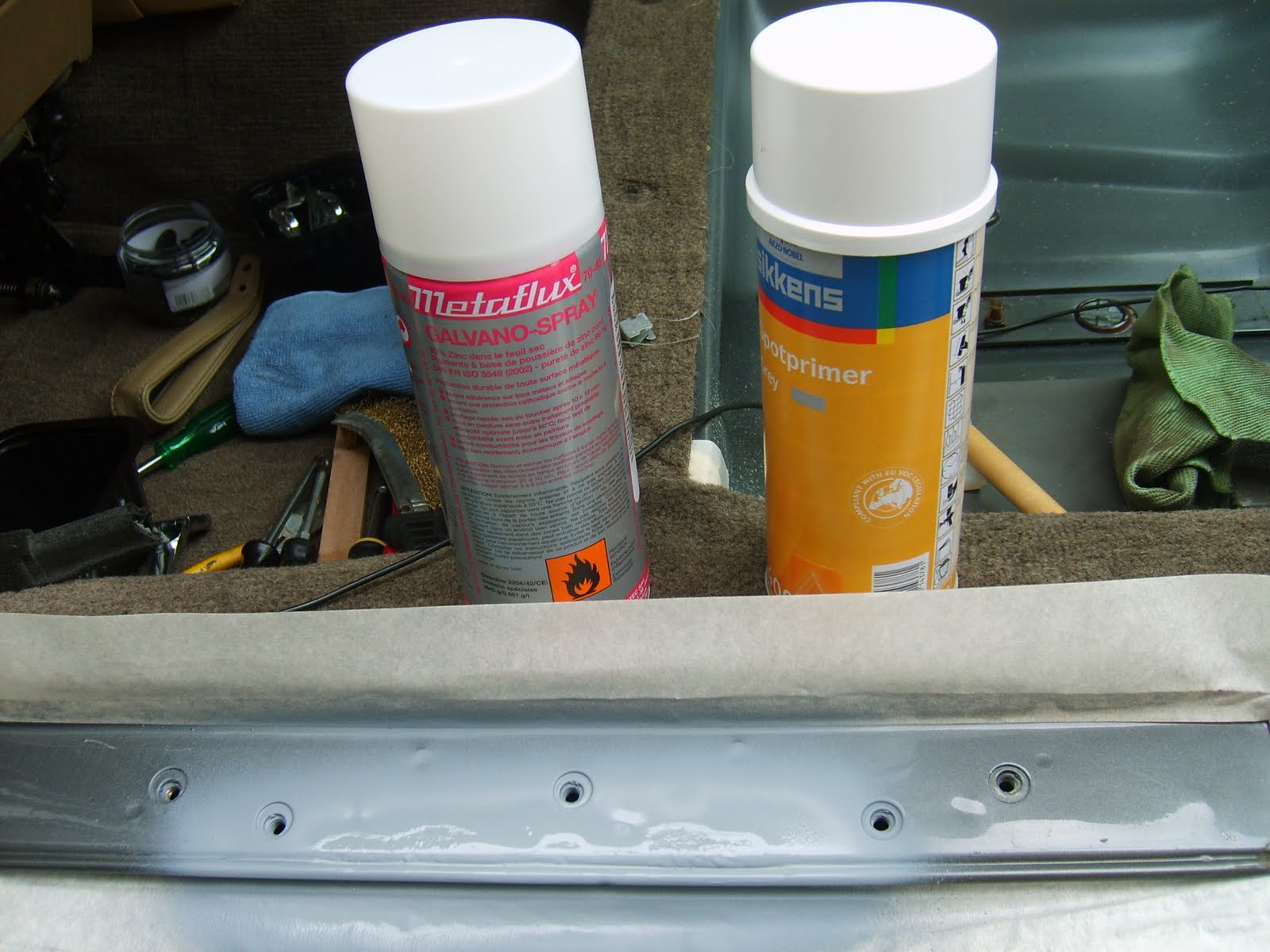 Met de stofzuiger alle vuil verwijderen en het hele goedje voorzien van een anti roest middel. Mijn voorkeur gaat uit naar Valvoline Tectyl: inwendige bescherming op wasbasis. Roestwerende en vochtverdrijvende beschermingswas voor inwendige bescherming van holle carrosserie delen zoals kokerbalken, deuren...