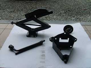 Ook de krik en houder heb ik ook terug mooi zwart geverfd. Bij montage zit het wel verscholen achter het reserve wiel maar als je het nodig hebt is het mooi proper en gesmeerd.