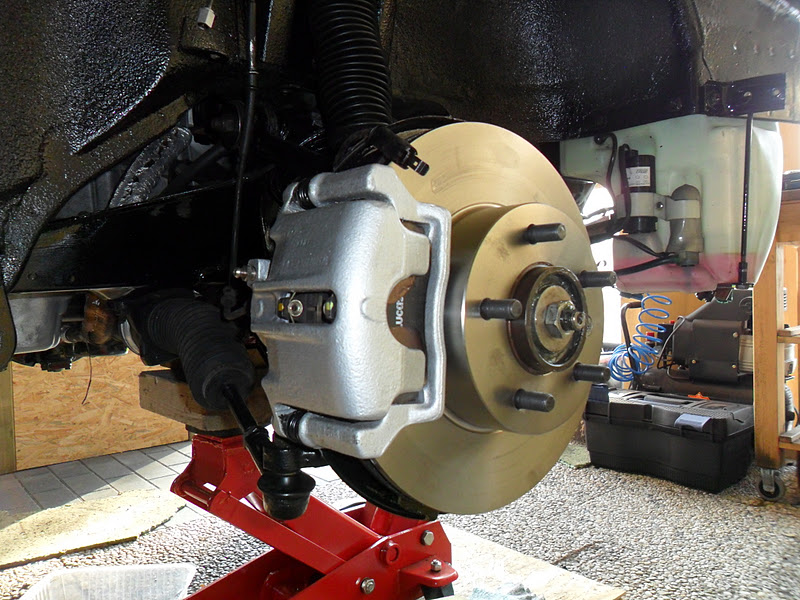 04 december 2011. We beginnen met de remmen achter. Alles mooi zuiver gemaakt, uit geborsteld en geblazen om nadien nieuwe remleidingen en blokjes te plaatsen. De remschoenen die in staan voor de handrem zijn nog ok. Het monteren van de leiding aan de linkerkant is niet eenvoudig. Te weinig ruimte om te bewegen.