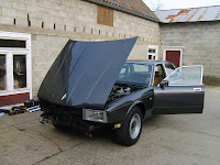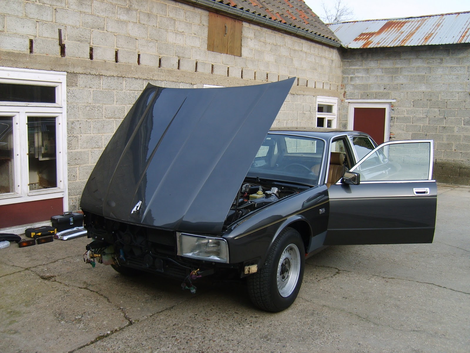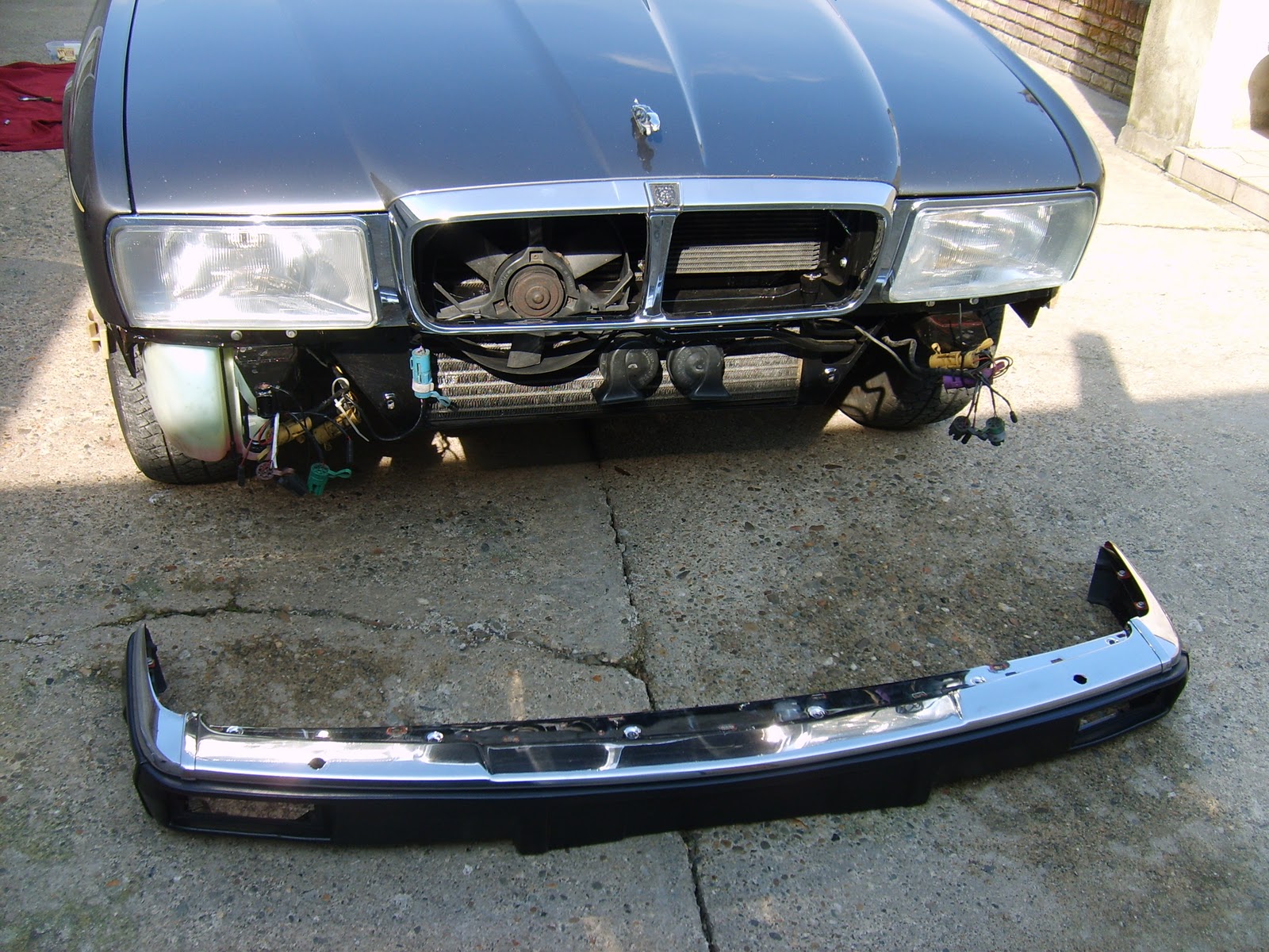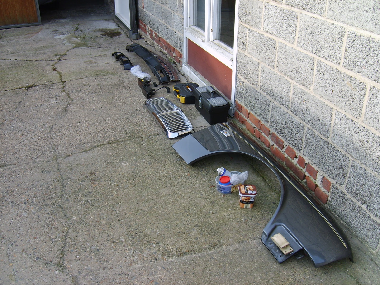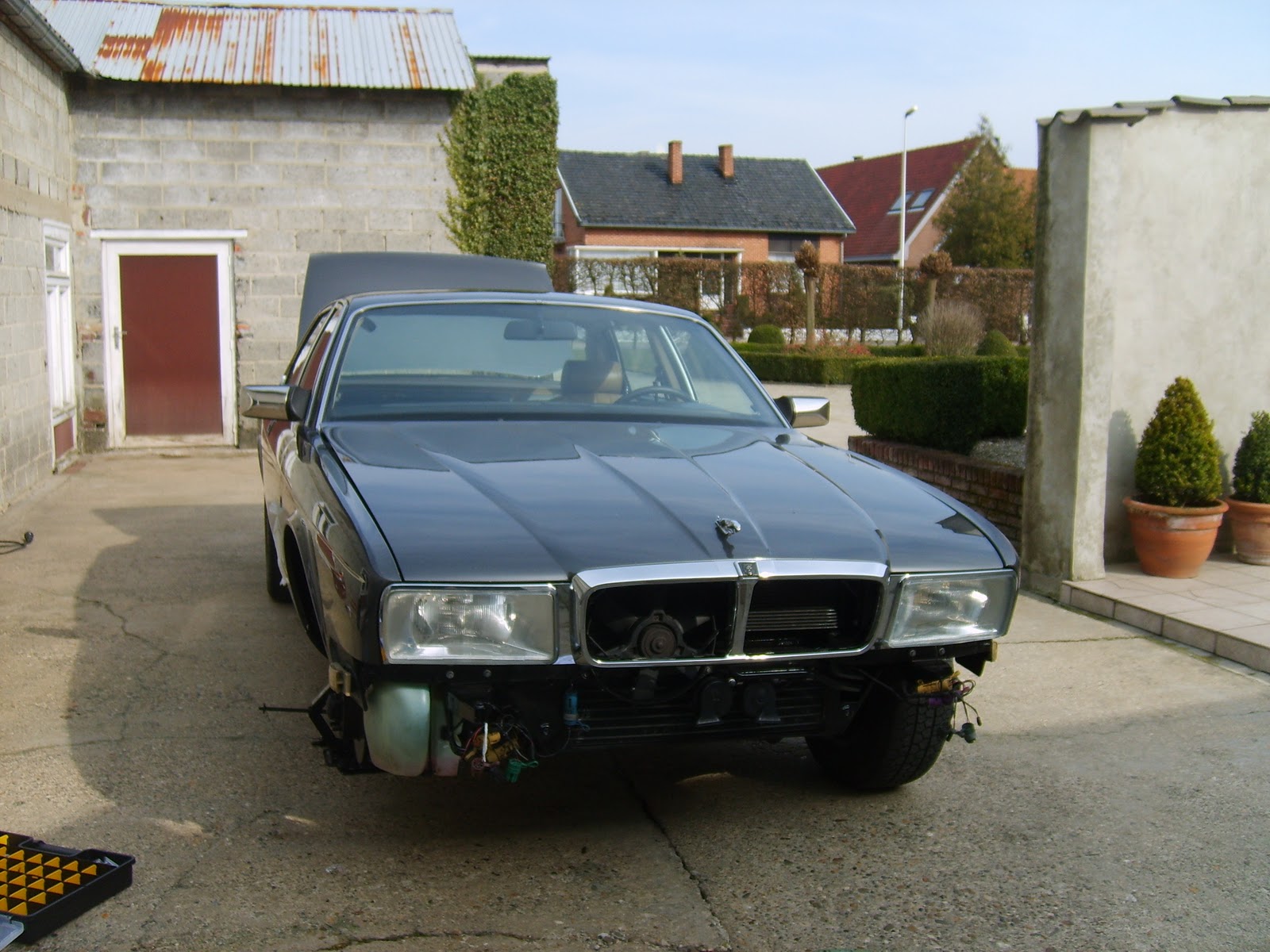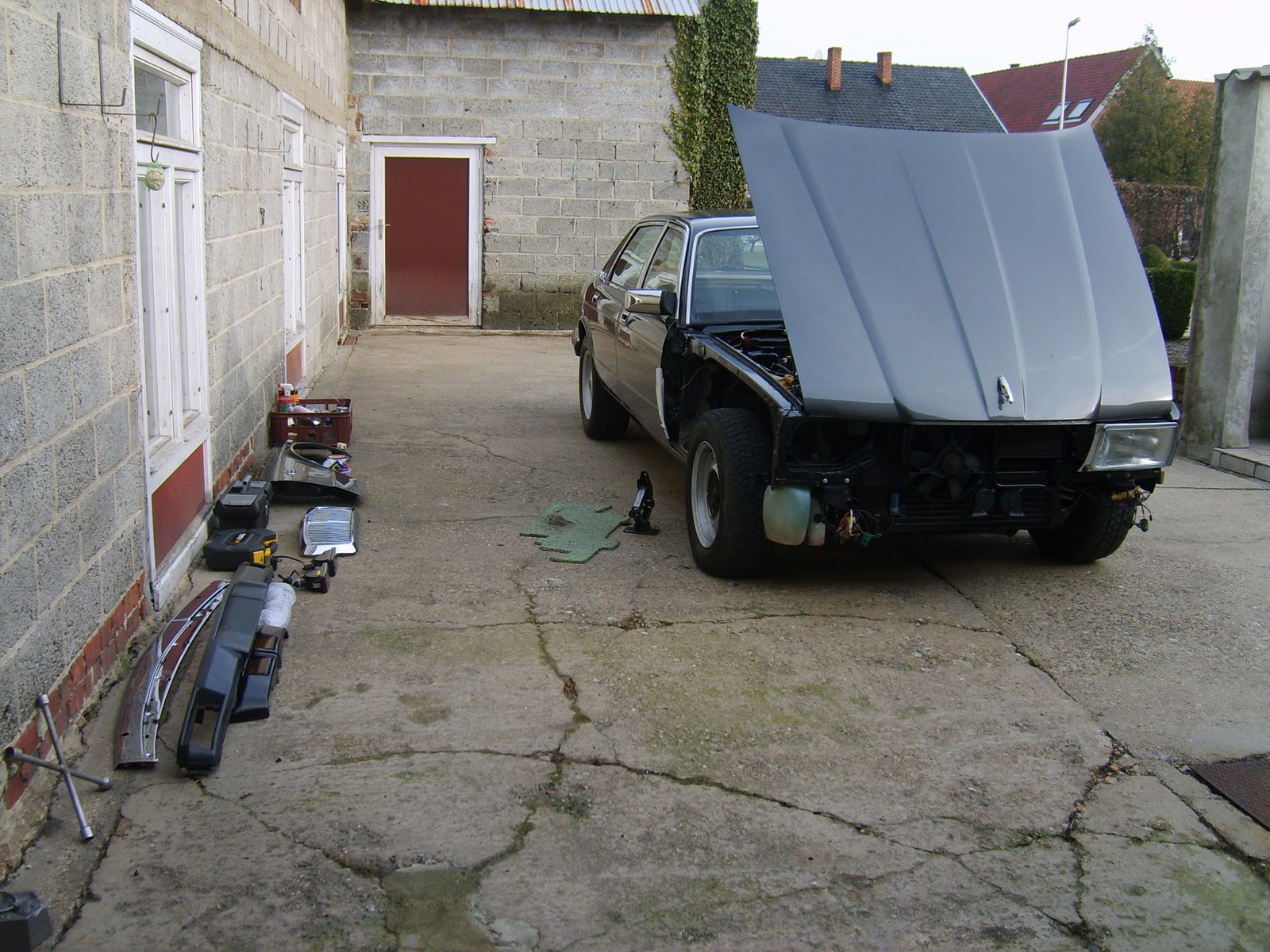 Het moment is aangebroken, nu de lente op komst is, om de Jag te verplaatsen van zijn winter stalling naar mijn verblijfplaats. Maar eerst moet hij nog aangekleed worden. Koplampen, bumper en dergelijke moeten gemonteerd worden.