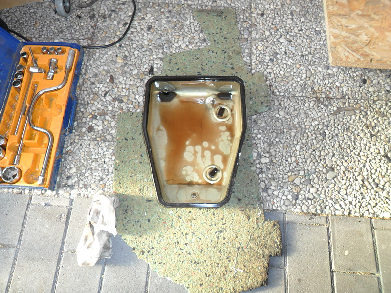 07 oktober 2011. Het vernieuwen van de AUTOMATIC GEARBOX FILTER KIT (JLM664kit) is noodzakelijk om de versnellingsbak in goede conditie te houden. Olie aftappen, koppeling losdraaien (30mm) en pan verwijderen door zes bouten te demonteren aan de zijkant rondom de pan. Niet echt moeilijk! Er mag ook eens iets vlot gaan, nietwaar! De oude olie zag er zwart en leek mij wat verwaterd.
